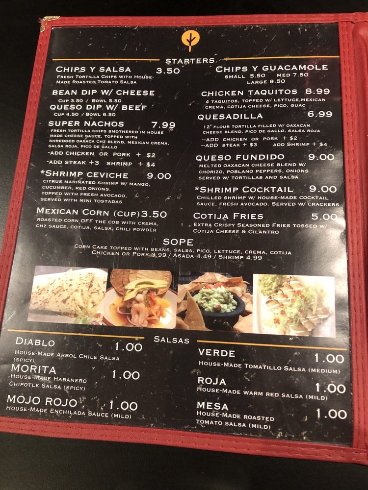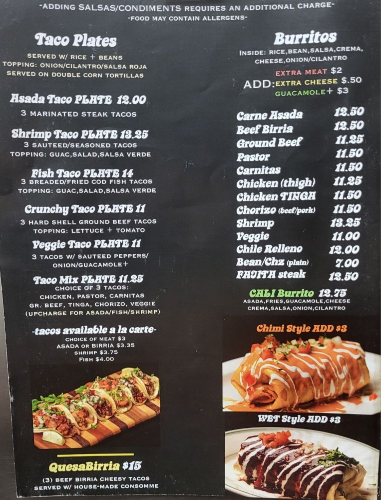 Red or green (choice of meat) with potatoes, crema, veggies and lettuce.